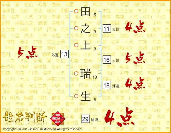 田(5画)之(3画)上(3画) 瑞(13画)生(5画)