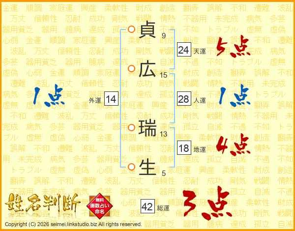貞(9画)広(15画) 瑞(13画)生(5画)