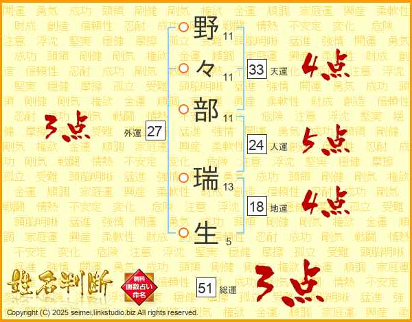 野(11画)々(11画)部(11画) 瑞(13画)生(5画)