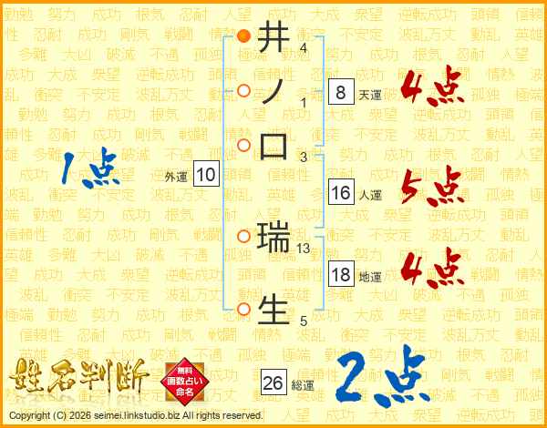 井(4画)ノ(1画)口(3画) 瑞(13画)生(5画)