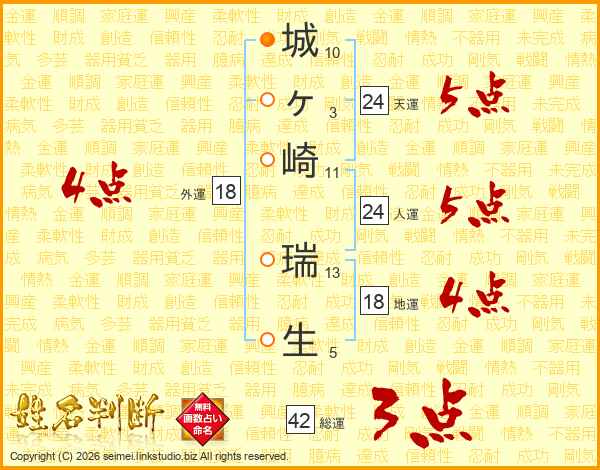 城(10画)ヶ(3画)崎(11画) 瑞(13画)生(5画)
