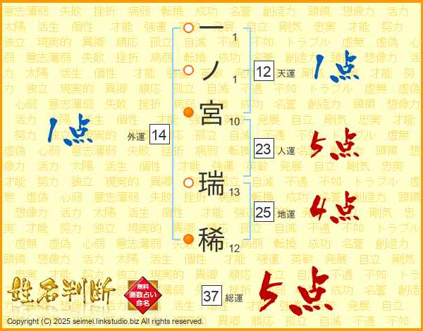 一(1画)ノ(1画)宮(10画) 瑞(13画)稀(12画)