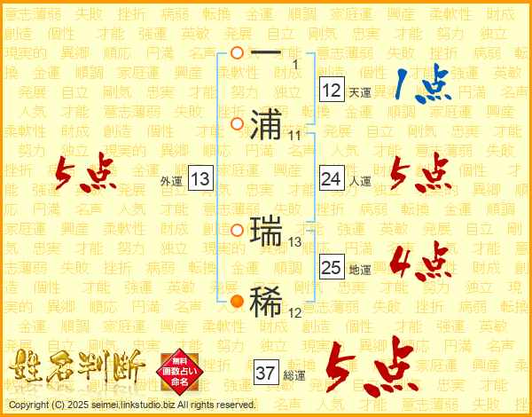 一(1画)浦(11画) 瑞(13画)稀(12画)