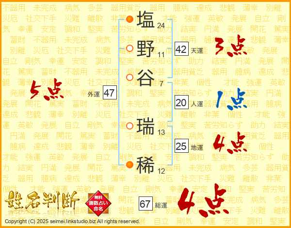 塩(24画)野(11画)谷(7画) 瑞(13画)稀(12画)