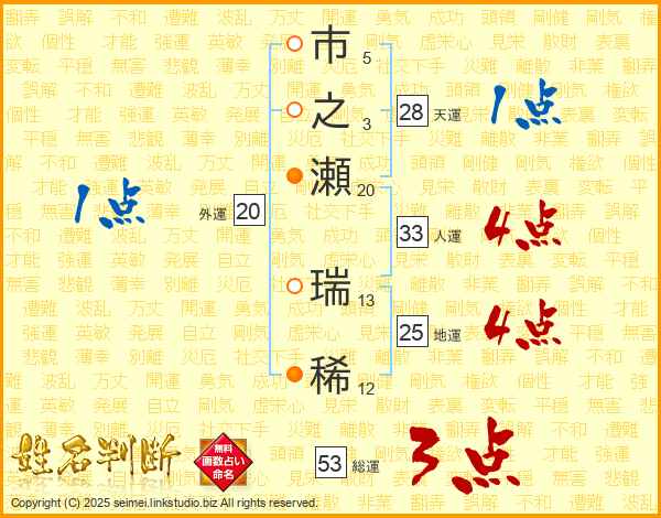 市(5画)之(3画)瀬(20画) 瑞(13画)稀(12画)