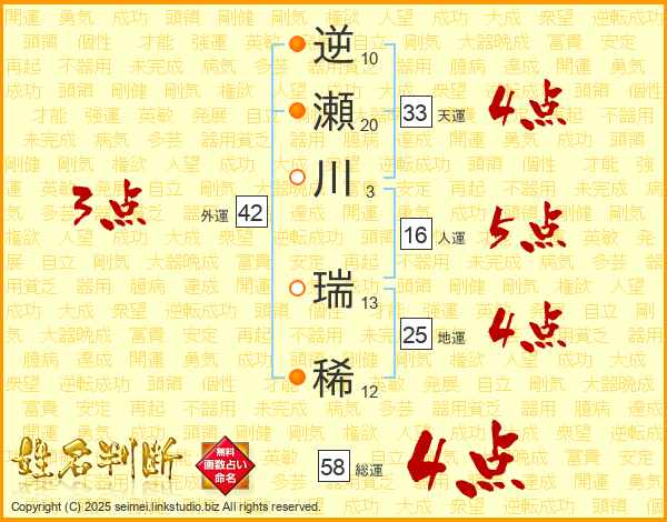 逆瀬川瑞稀さんの総運は58画の4点!