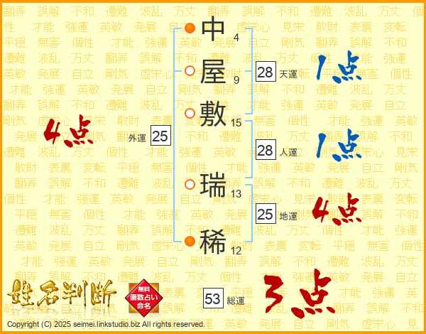 中(4画)屋(9画)敷(15画) 瑞(13画)稀(12画)