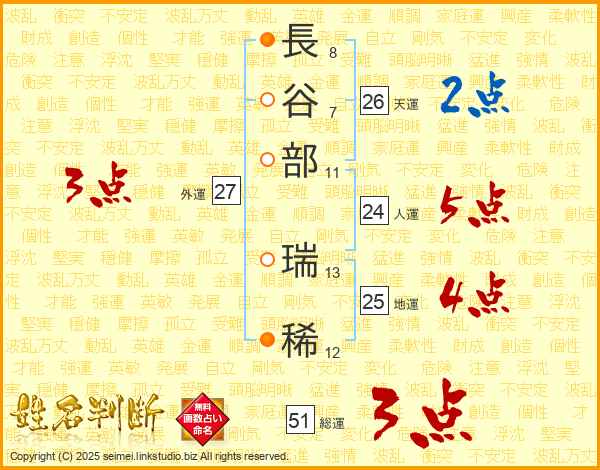 長(8画)谷(7画)部(11画) 瑞(13画)稀(12画)