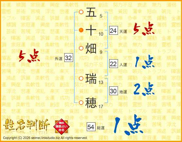 五(5画)十(10画)畑(9画) 瑞(13画)穂(17画)