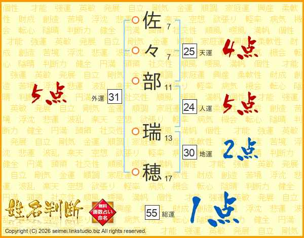 佐(7画)々(7画)部(11画) 瑞(13画)穂(17画)