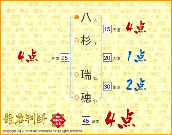 八(8画)杉(7画) 瑞(13画)穂(17画)