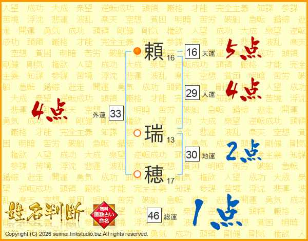 生活面を象徴する運勢です。外部から受ける影響力を表し、結婚運、家庭運や職場、環境への順応性を表します。総運から人運を引いた画数。姓や名が1文字の場合を除く。