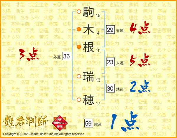 駒(15画)木(4画)根(10画) 瑞(13画)穂(17画)