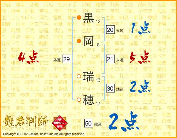 黒(12画)岡(8画) 瑞(13画)穂(17画)