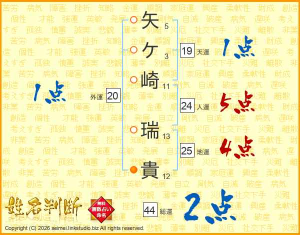 矢ケ崎瑞貴さんの総運は44画の2点!