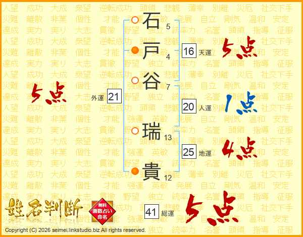 石(5画)戸(4画)谷(7画) 瑞(13画)貴(12画)