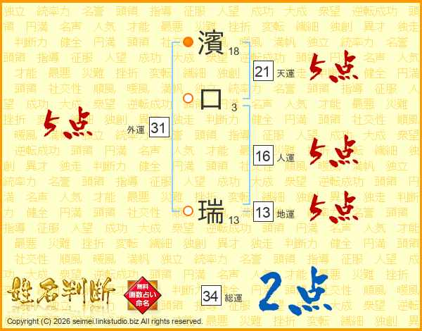 濱口瑞さんの天運は21画の5点!