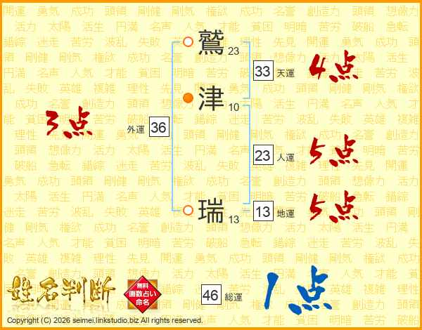 生活面を象徴する運勢です。外部から受ける影響力を表し、結婚運、家庭運や職場、環境への順応性を表します。総運から人運を引いた画数。姓や名が1文字の場合を除く。