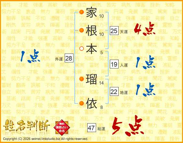 家(10画)根(10画)本(5画) 瑠(14画)依(8画)