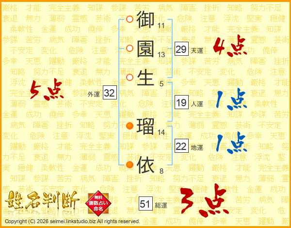 御(11画)園(13画)生(5画) 瑠(14画)依(8画)