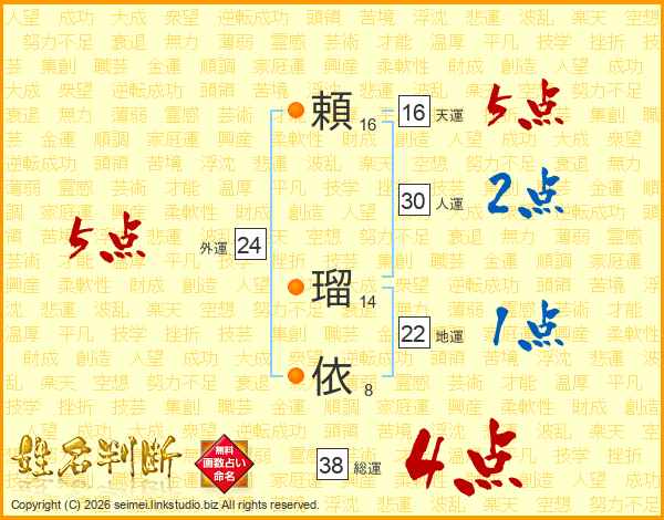 頼(16画) 瑠(14画)依(8画)