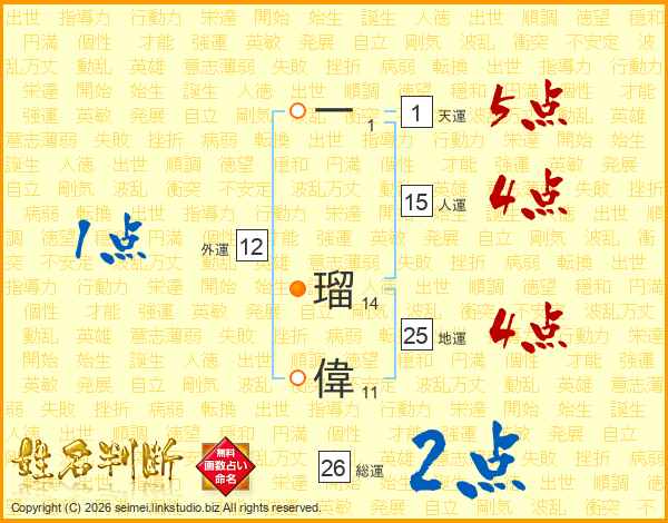 一(1画) 瑠(14画)偉(11画)