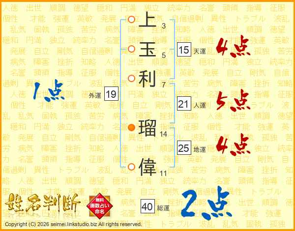 上(3画)玉(5画)利(7画) 瑠(14画)偉(11画)