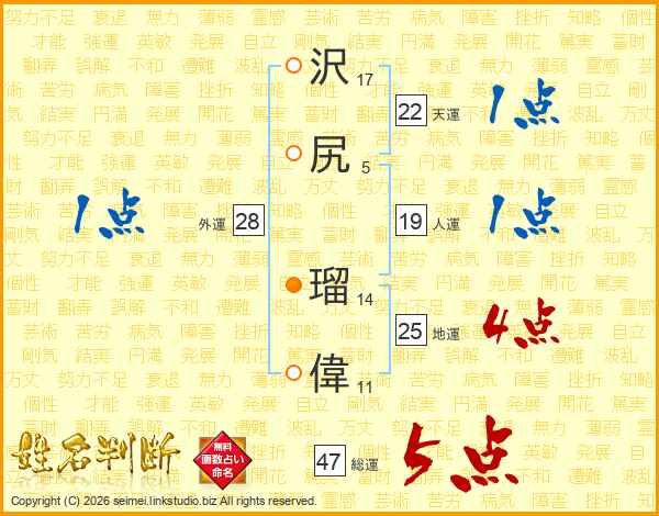 沢(17画)尻(5画) 瑠(14画)偉(11画)