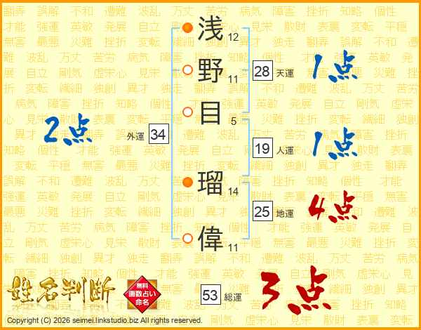 浅(12画)野(11画)目(5画) 瑠(14画)偉(11画)