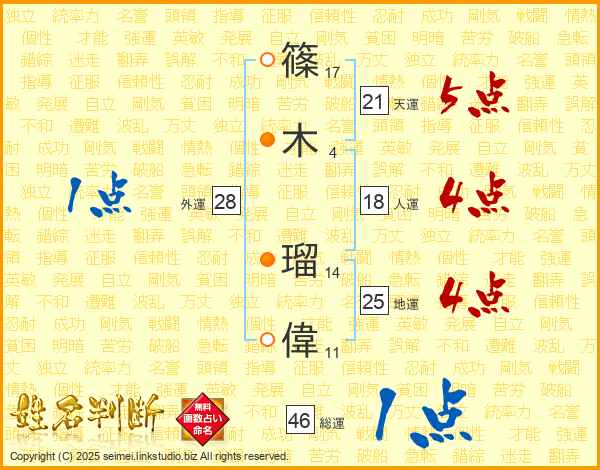 篠(17画)木(4画) 瑠(14画)偉(11画)