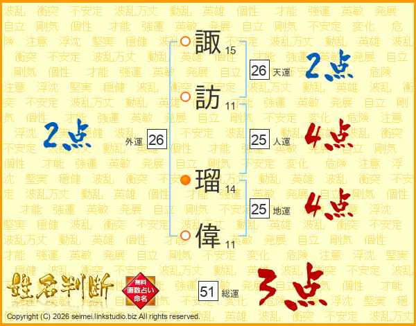 諏(15画)訪(11画) 瑠(14画)偉(11画)