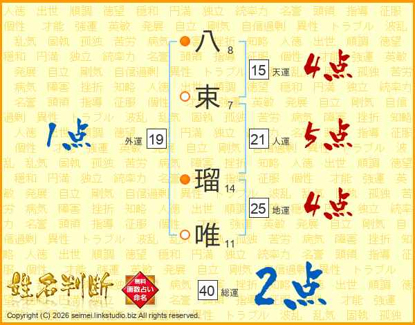 八(8画)束(7画) 瑠(14画)唯(11画)