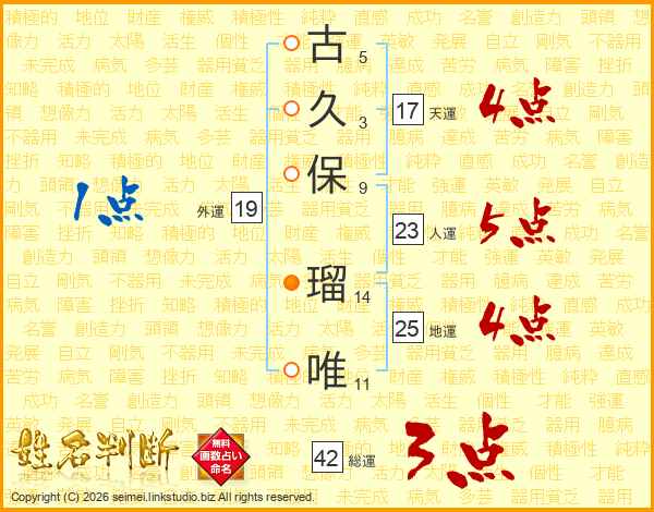 古(5画)久(3画)保(9画) 瑠(14画)唯(11画)