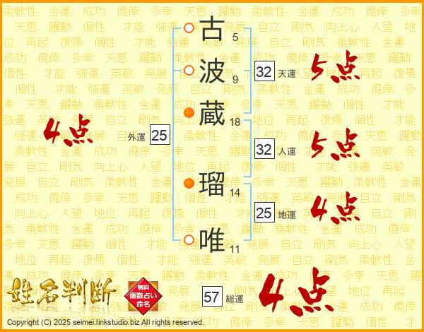 古(5画)波(9画)蔵(18画) 瑠(14画)唯(11画)