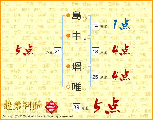 島(10画)中(4画) 瑠(14画)唯(11画)