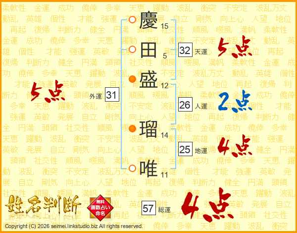 慶(15画)田(5画)盛(12画) 瑠(14画)唯(11画)