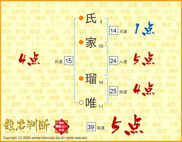 氏(4画)家(10画) 瑠(14画)唯(11画)