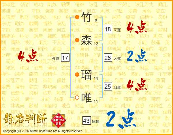 竹森瑠唯さんの人運は26画の2点!