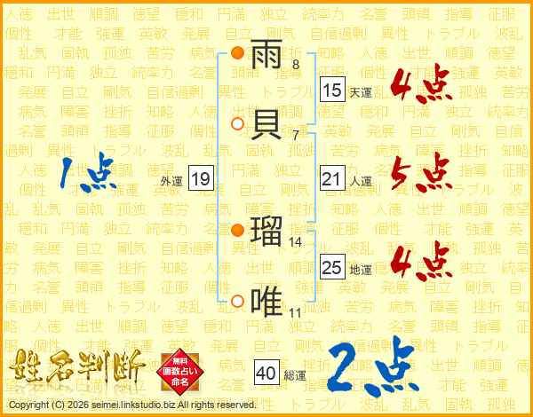 雨(8画)貝(7画) 瑠(14画)唯(11画)