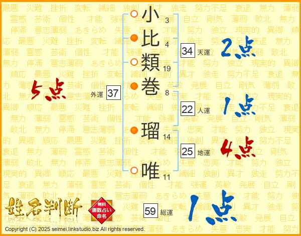 小(3画)比(4画)類(19画)巻(8画) 瑠(14画)唯(11画)