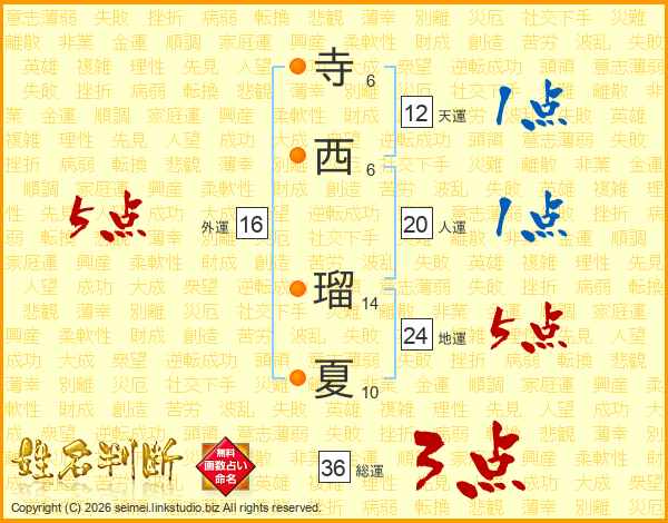 寺(6画)西(6画) 瑠(14画)夏(10画)