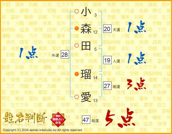 小(3画)森(12画)田(5画) 瑠(14画)愛(13画)