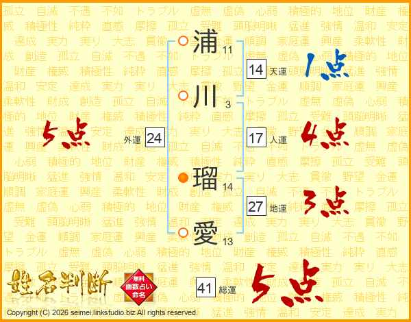 浦(11画)川(3画) 瑠(14画)愛(13画)