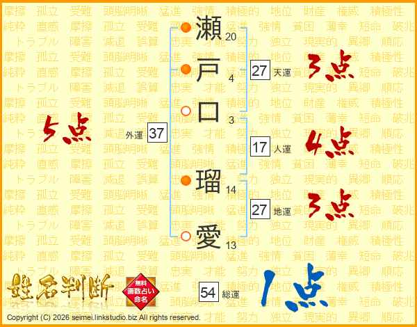 瀬(20画)戸(4画)口(3画) 瑠(14画)愛(13画)