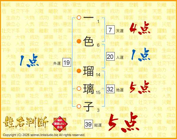 一(1画)色(6画) 瑠(14画)璃(15画)子(3画)