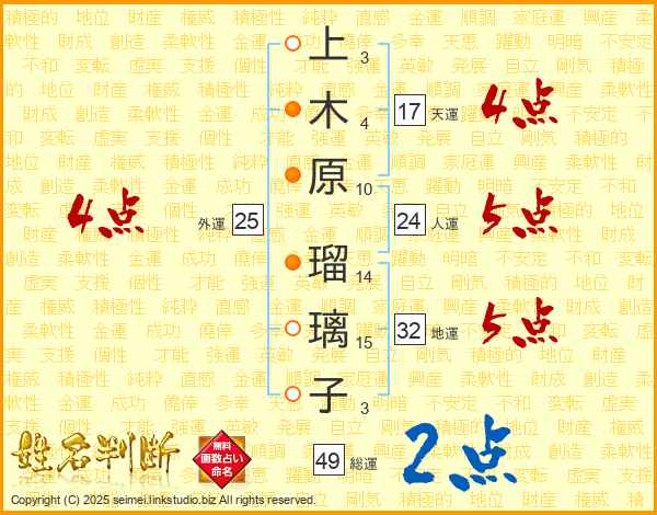 上(3画)木(4画)原(10画) 瑠(14画)璃(15画)子(3画)