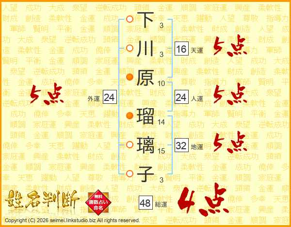 下(3画)川(3画)原(10画) 瑠(14画)璃(15画)子(3画)