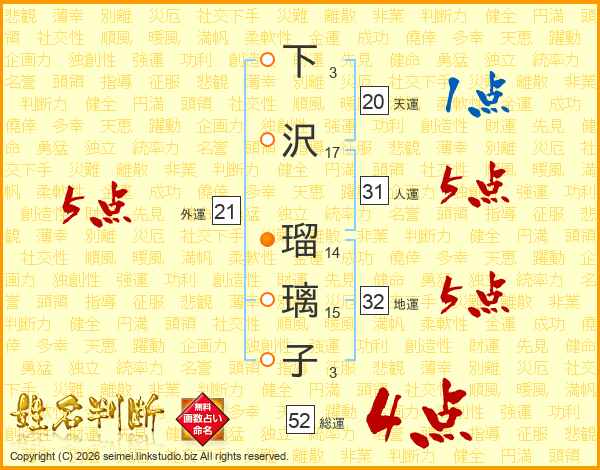 下沢瑠璃子さんの総運は52画の4点!