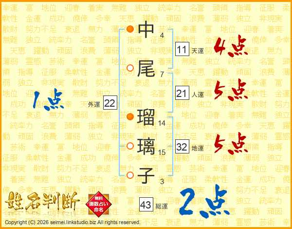 中(4画)尾(7画) 瑠(14画)璃(15画)子(3画)