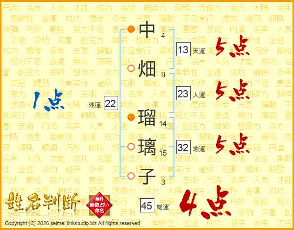 中畑瑠璃子さんの総運は45画の4点!